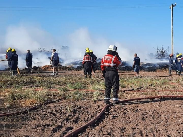 El primer foco, alertado a las 13.30, se ubicó cerca de la planta Bayer, sobre la Ruta 6. Más tarde, a las 17.00, una segunda salida asistió un fuego de gran magnitud en un campo de rastrojo, donde los fardos de pastura se propagaron rápidamente debido a los fuertes vientos.