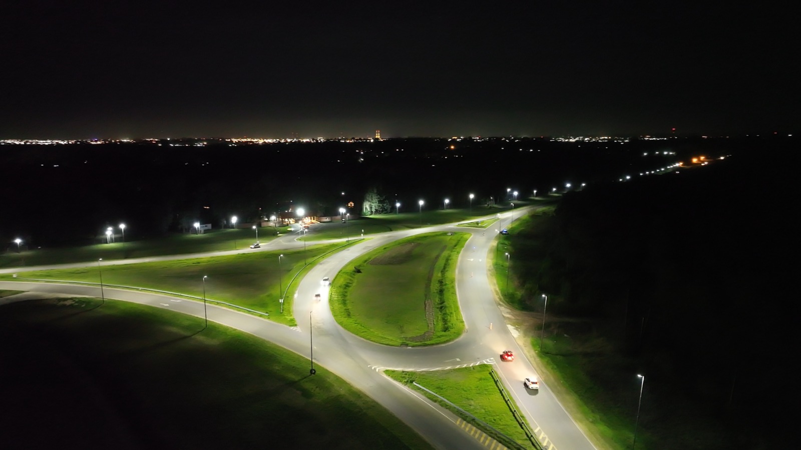 Las tareas incluyeron reparación de columnas y cableado, instalación de nuevos tableros, conexiones aéreas y subterráneas, así como la incorporación de luminarias de última generación, con el objetivo de mejorar la visibilidad en cruces y rotondas, y reforzar la seguridad de quienes circulan por la red vial.